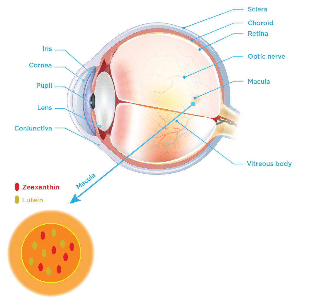 The macula and the lens are two essential eye tissues involved in the vision process. Among all carotenoids found in the human diet and bloodstream, only lutein and zeaxanthin are present in these critical tissues. In 1945, George Wald analyzed macular pigment (MP) and identified lutein, zeaxanthin, and its oxygenated form, mesozeaxanthin, as the compounds responsible for its yellow coloration. The distribution of these carotenoids within the retina varies, with zeaxanthin being the predominant carotenoid in the central region and lutein more abundant in the peripheral areas.